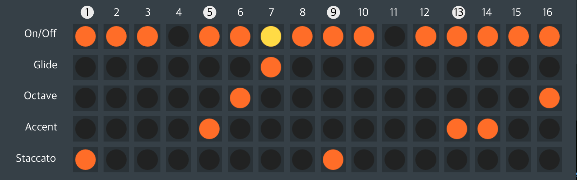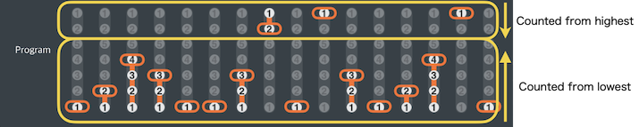 The upper row sets the number of the note to be played counting from the top of the note-on state, and the lower row sets the number of the note to be played counting from the bottom.