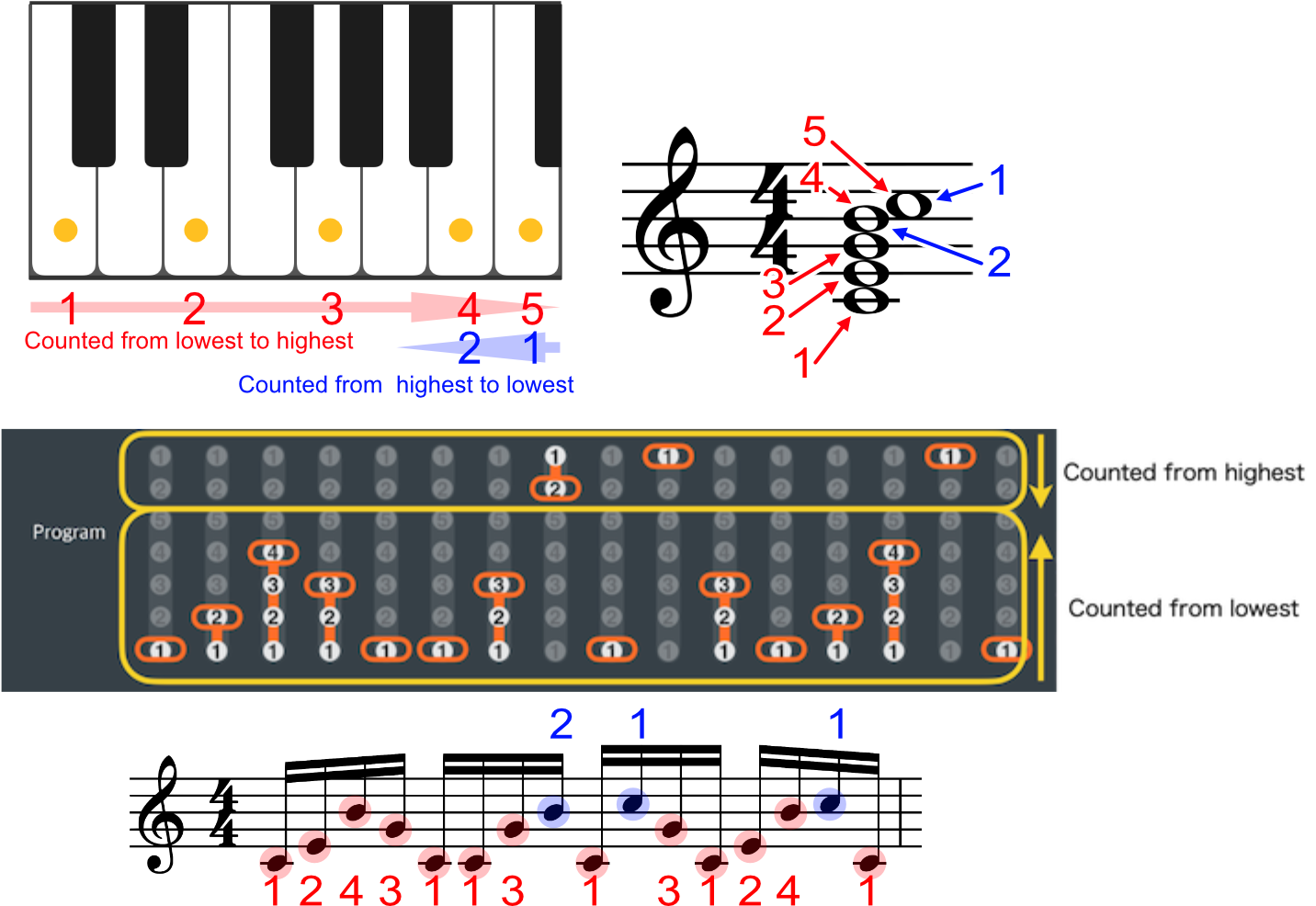 Imagine a style of playing in which the left hand holds the chord and the right hand plays the melody-like moving notes that appear in the arpeggio. If there is a way to count from the top, there is always a way to include the notes added by that right hand in the arpeggio. With the counting from the bottom method, it is impossible to locate the notes held by the right hand because the left hand does not know how many notes it will hold. Therefore, there are two ways to count from the top and two ways to count from the bottom.