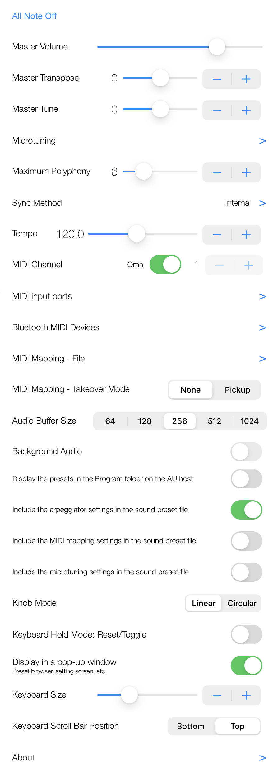 Set whether to use pop-up display when running as AUv3. If this is set to OFF, the screen will not close even if you interact with the UI of the host app. Turn it off if you want to adjust the tone while playing the keyboard of the host app.