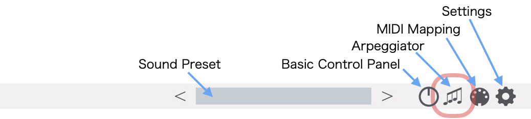 The arpeggiator rhythmically disperses MIDI signals from the host app or pressed chords from the on-screen keyboard. If you input a single note, the input single note will be repeated. When multiple notes are input at the same time, they are rhythmically dispersed as an arpeggio. Unless you use the "Hold" function, the arpeggiator will work only between note ON and OFF.